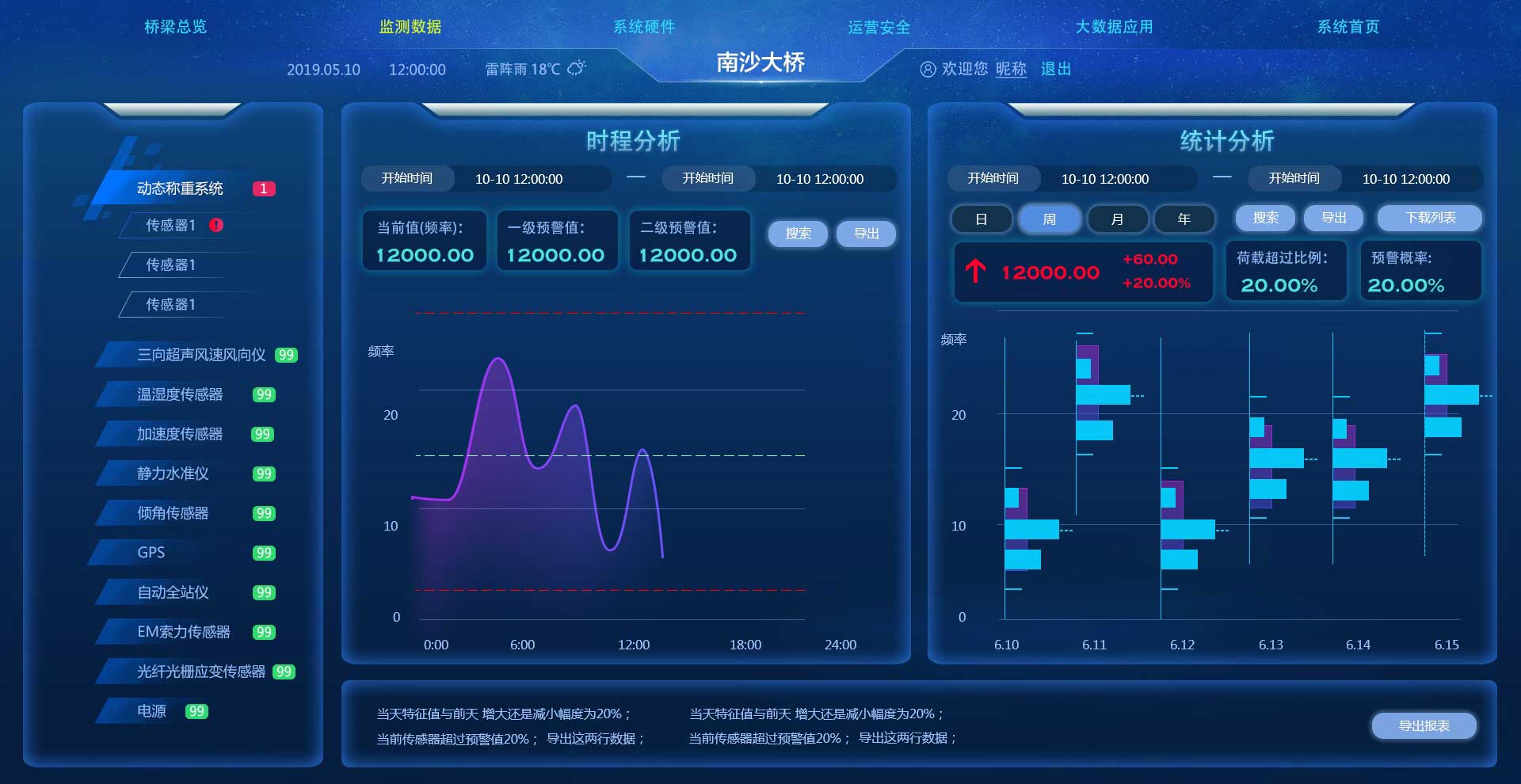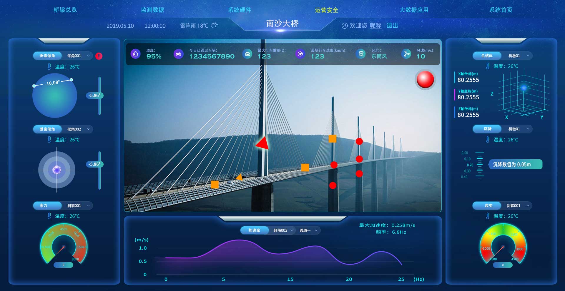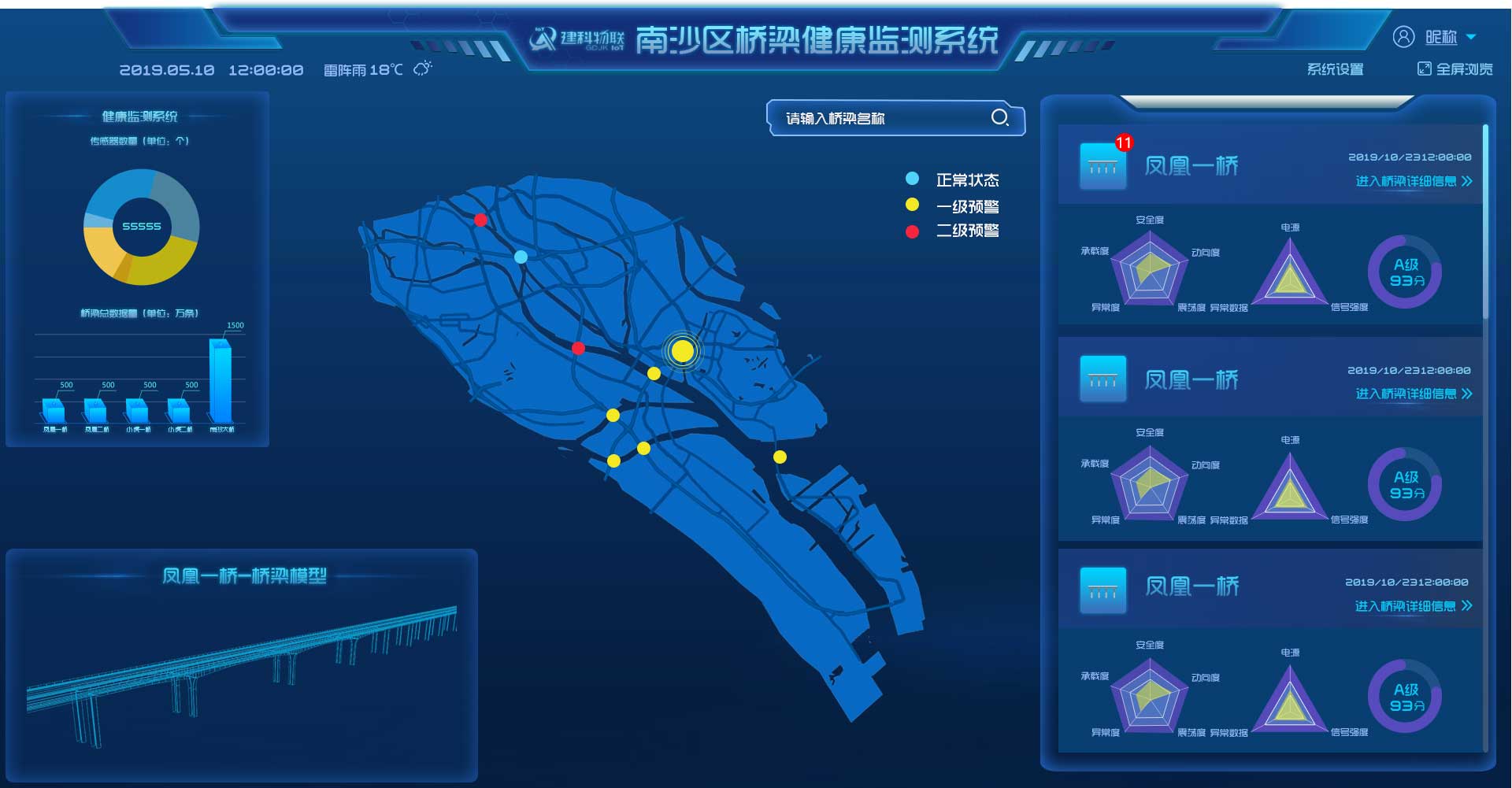 运用物联网技术,使用13类传感器,实时回传桥梁数据,使用大数据特有算法,进行数据处理,做出对应预警和展示